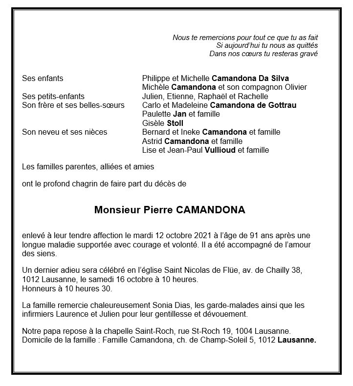 Monsieur Pierre CAMANDONA 21 fév. 1930 - 12 oct. 2021 Avis mortuaire PFG Télecharger PDF Partager sur: Galerie PreviousNext PreviousNext