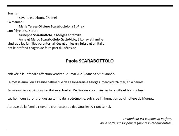Paola SCARABOTTOLA 04 mai. 1966 - 21 mai. 2021 Avis mortuaire PFG Télecharger PDF Partager sur: Galerie PreviousNext PreviousNext
