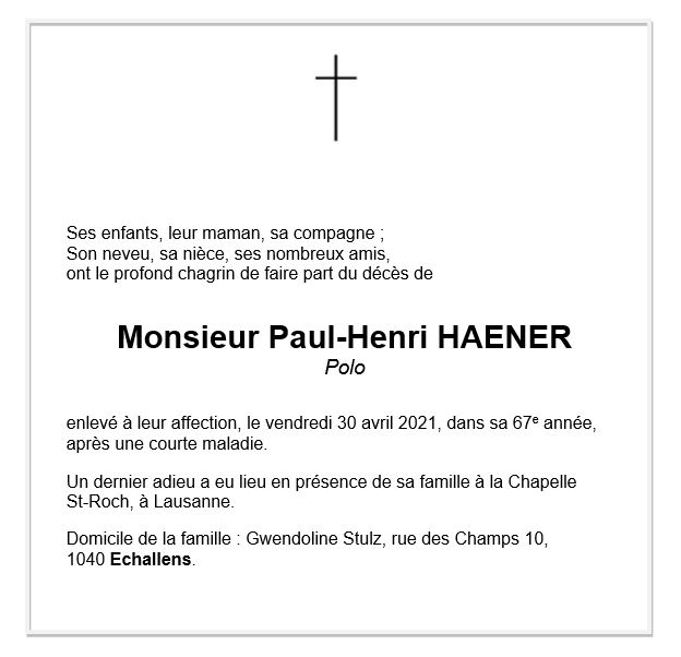 Paul-Henri HAENER 16 nov. 1954 - 30 avr. 2021 Avis mortuaire PFG Télecharger PDF Partager sur: Galerie PreviousNext PreviousNext