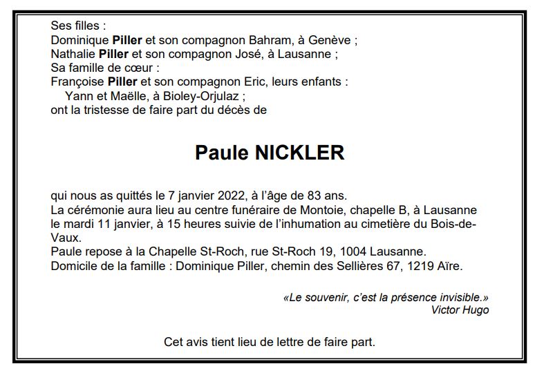 Paule NICKLER 22 mai. 1938 - 07 jan. 2022 Avis mortuaire PFG Télecharger PDF Partager sur: Galerie PreviousNext PreviousNext