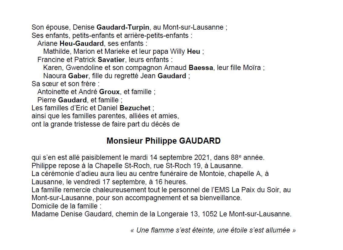 Philippe GAUDARD 10 oct. 1933 - 14 sep. 2021 Avis mortuaire PFG Télecharger PDF Partager sur: Galerie PreviousNext PreviousNext