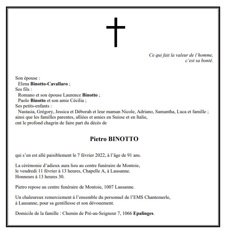 Pietro BINOTTO 08 déc. 1930 - 07 fév. 2022 Avis mortuaire PFG Télecharger PDF Partager sur: Galerie PreviousNext PreviousNext
