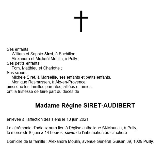 Régine SIRET-AUDIBERT 27 juil. 1943 - 13 juin. 2021 Avis mortuaire PFG Télecharger PDF Partager sur: Galerie PreviousNext PreviousNext