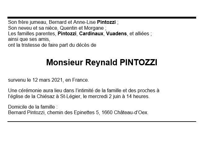 Reynald PINTOZZI 12 mar. 2021 Avis mortuaire PFG Télecharger PDF Partager sur: Galerie PreviousNext PreviousNext