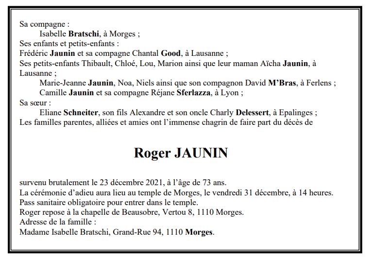 Roger JAUNIN 29 oct. 1948 - 23 déc. 2021 Avis mortuaire PFG Télecharger PDF Partager sur: Galerie PreviousNext PreviousNext