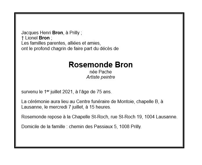 Rosemonde BRON 14 aoû. 1945 - 01 juil. 2021 Avis mortuaire PFG Télecharger PDF Partager sur: Galerie PreviousNext PreviousNext