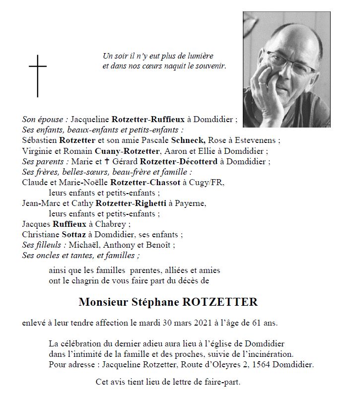 Stéphane ROTZETTER 12 fév. 1960 - 30 mar. 2021 Avis mortuaire PFG Télecharger PDF Partager sur: Galerie PreviousNext PreviousNext