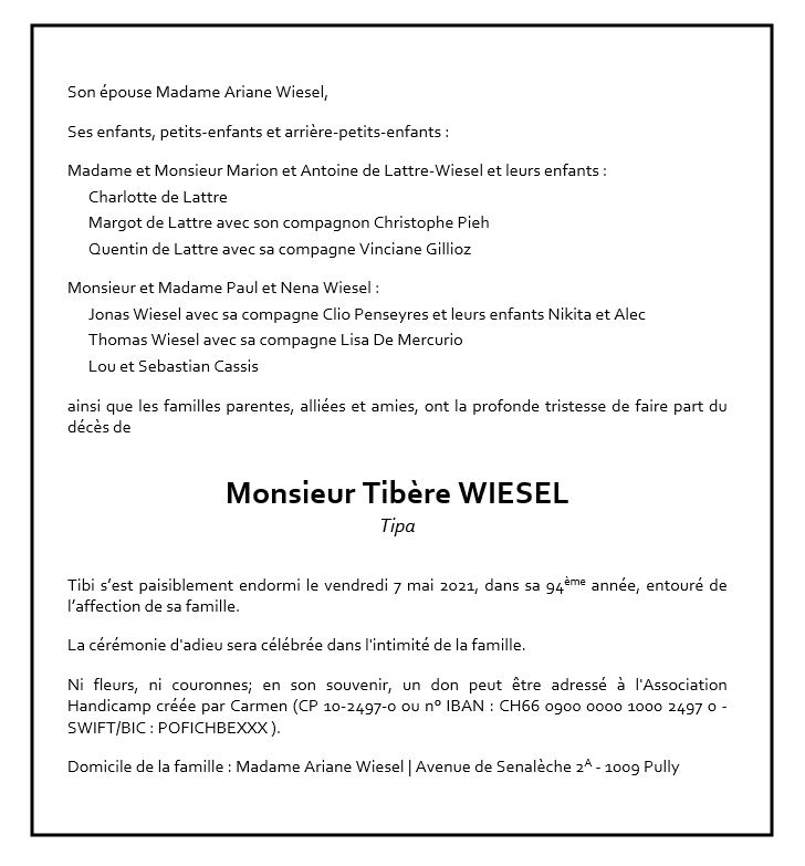 Tibère WIESEL 11 aoû. 1927 - 07 mai. 2021 Avis mortuaire PFG Télecharger PDF Partager sur: Galerie PreviousNext PreviousNext