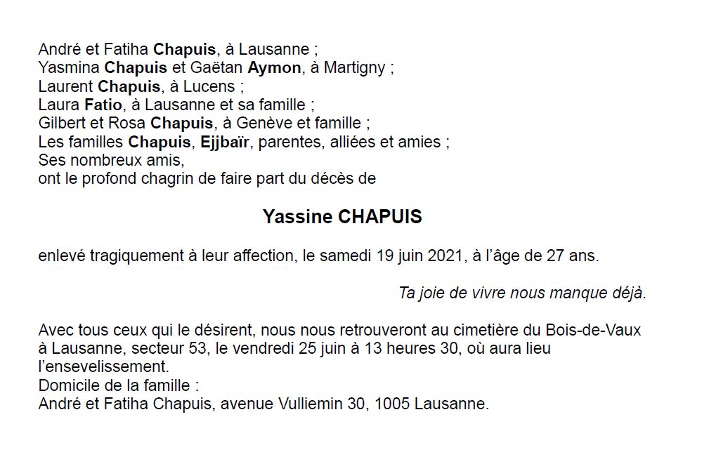 Yassine Chapuis 13 nov. 1993 - 19 juin. 2021 Avis mortuaire PFG Télecharger PDF Partager sur: Galerie PreviousNext PreviousNext